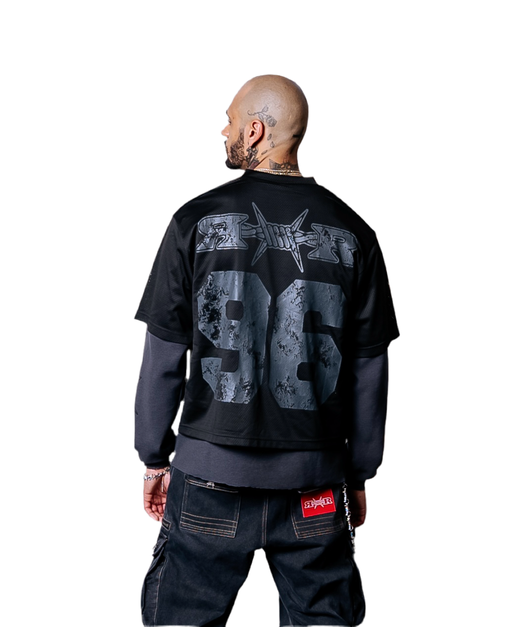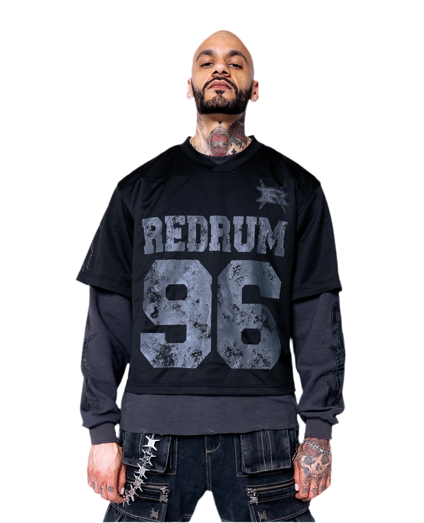 Our double layer jersey long sleeve tee. Heavyweight mesh jersey, screen printed, waffle knit under layer with distressing.