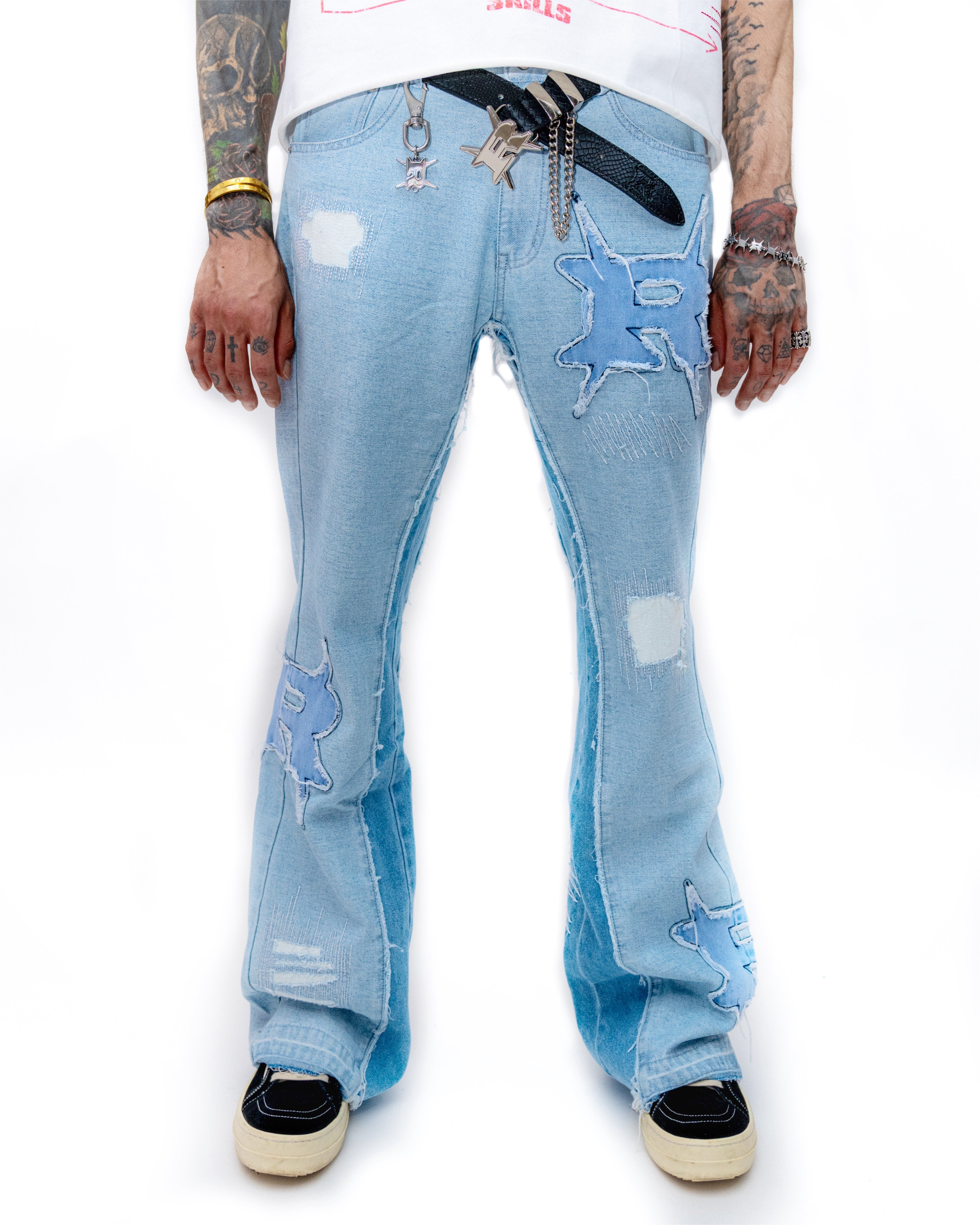 Our first denim for Fall 2025, inside out split seam jeans. The inner layer made of 14oz indigo dyed denim, the outer layer made of 14oz inside out denim. Indigo denim R hand cut logos, repaired rip stitching through out.